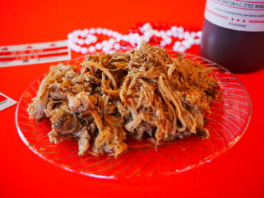 A DC delicacy, the half smoke is a seasoned, all beef, quarter pound, hotdog-style link, especially scrumptious when topped with chili.